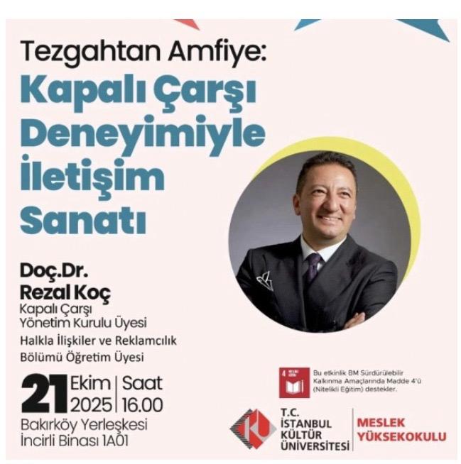 İstanbul Kültür Üniversitesi Meslek Yüksekokulu’nda, Doç. Dr. Rezal Koç’un konuşmacı olarak yer aldığı “Tezgahtan Amfiye: Kapalı Çarşı Deneyimiyle İletişim Sanatı” başlıklı etkinlik 21 Ekim 2025 Salı günü Bakırköy Yerleşkesi’nde gerçekleştirildi.